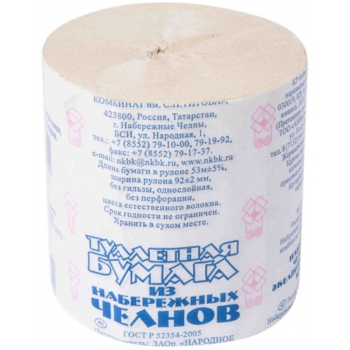 Бумага туалетная бытовая «ИЗ НАБЕРЕЖНЫХ ЧЕЛНОВ», 53 метра, без втулки