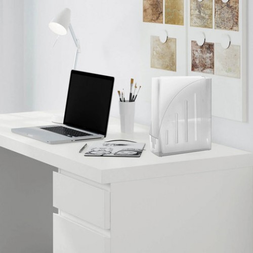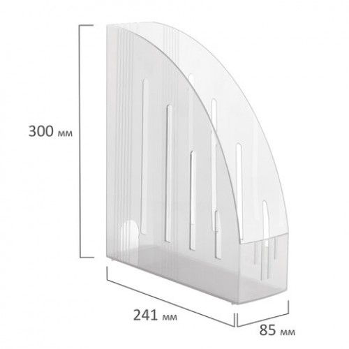 Вертикальный прозрачный пластиковый лоток с одним отделением предназначен для хранения бумаг формата А4. Изготовлен из высококачественного ударопрочного полистирола толщиной 2 мм. Представляет собой устойчивую неразборную конструкцию эргономичного дизайна с отверстиями для захвата.