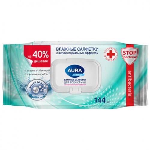 Салфетки влажные 144 шт., AURA Family, антибактериальные, крышка клапан