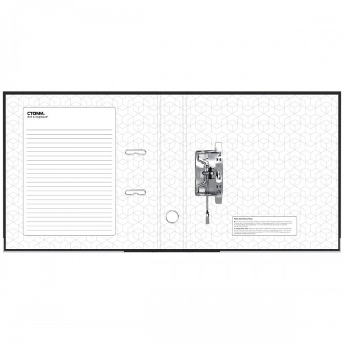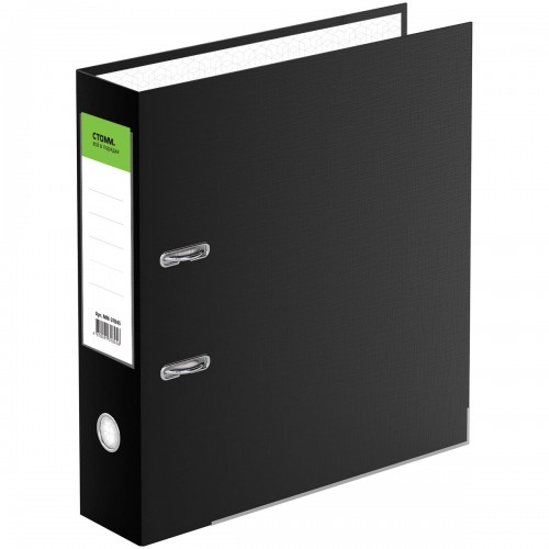 Папка-регистратор «СТАММ» с арочным механизмом эффективно экономит офисное пространство и идеальна для создания архива. Размер папки – 320*290*70 мм. Ориентация – вертикальная. Минималистичный классический дизайн: папка выполнена в глубоком чёрном цвете. Изготовлена из жесткого износостойкого картона с односторонним покрытием из бумвинила. Нижние грани укреплены металлическим кантом. Внутреннее покрытие – бумага. Конструкция разработана с учетом всех особенностей эксплуатации. Эргономичное отверстие в корешке помогает быстро снять папку с полки. На корешке папки есть карман со сменным информационным ярлыком для маркировки. На внутренней стороне обложки папка-регистратор имеет поле для записи.