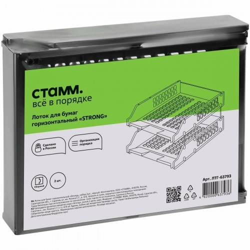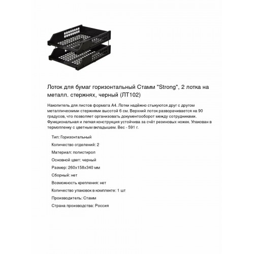 Лоток для бумаг Стамм "Strong" поставляется в количестве 2 штук в одной упаковке. Размеры лотка составляют: высота - 15,8 см, ширина - 26 см, глубина - 33,5 см.