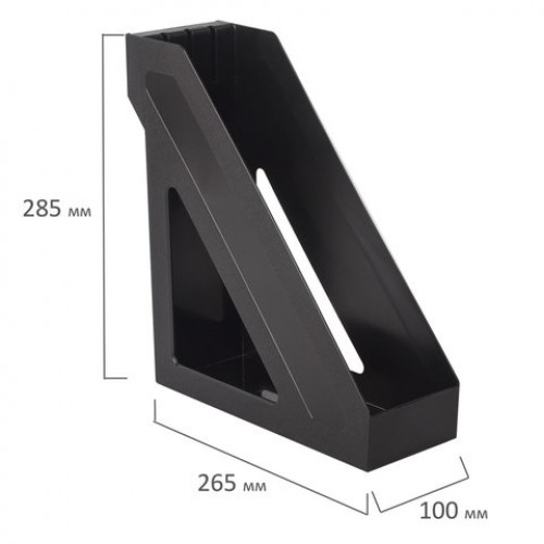 Выполнен в черном цвете, с одним отделением и с табличкой для маркировки. Предназначен для хранения бумаг формата А4. Представляет собой устойчивую неразборную конструкцию из гладкого пластика с шагреневыми вставками и отверстиями по бокам. Размеры: высота - 285 мм, ширина - 100 мм, глубина - 265 мм.